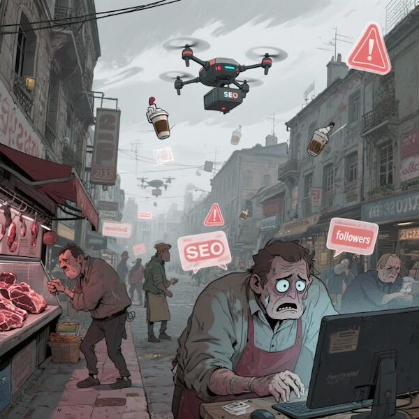 Le boucher ne parle plus qu’en langage SEO : “Steak haché 500 mots-clés, taux de clic garanti !”. Il est devenu un vrai (mauvais) community manager.