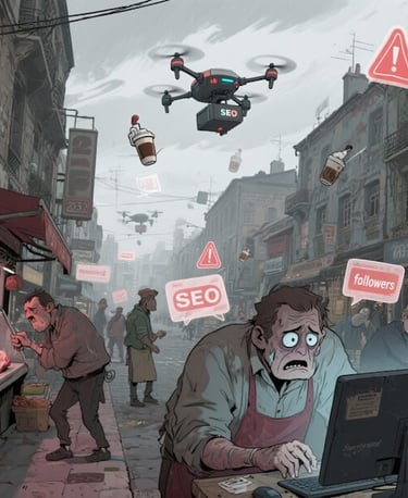 Imaginez : en 2032, les indépendants sont devenus des producteurs de contenu. Le café en spray pour tenir, le boucher qui parle en mots clés… On ne vend presque plus : on publie… Et pourtant…